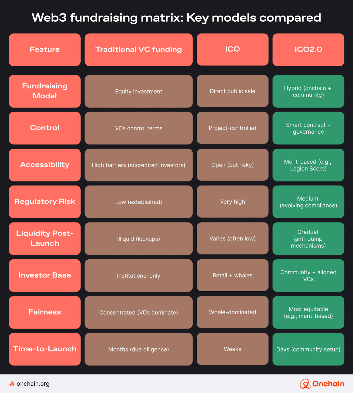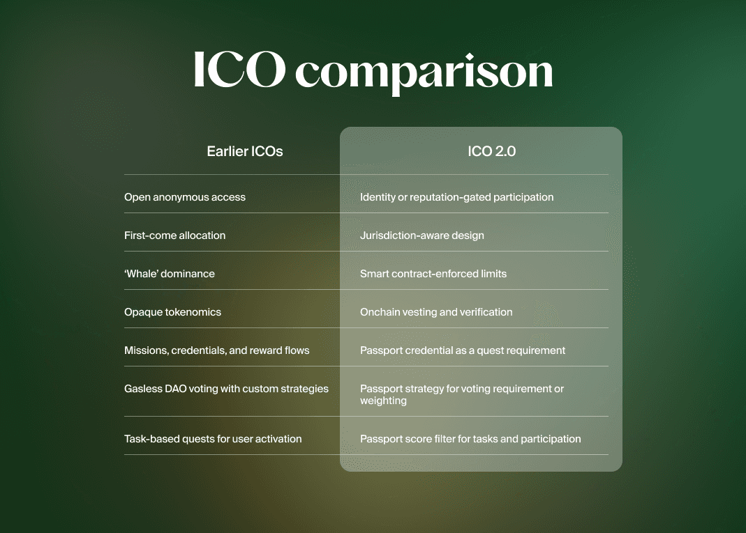 The defining change for 2026 ICOs is the selection of participants - from open, first-come-first-served unregulated access to gated jurisdiction-aware participation, with access limits enforced through smart contracts. Below is the table explaining the shift.